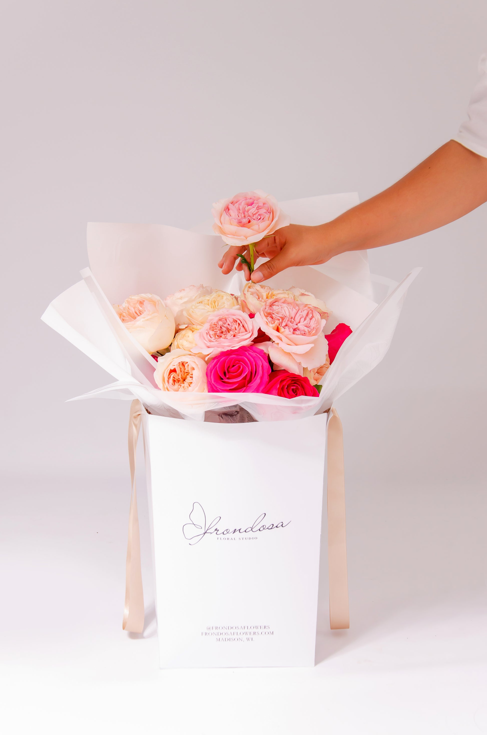 22 stems of classic roses in soft pink and cream. Color can be customized upon request and availability. Includes a bag and personalized card.