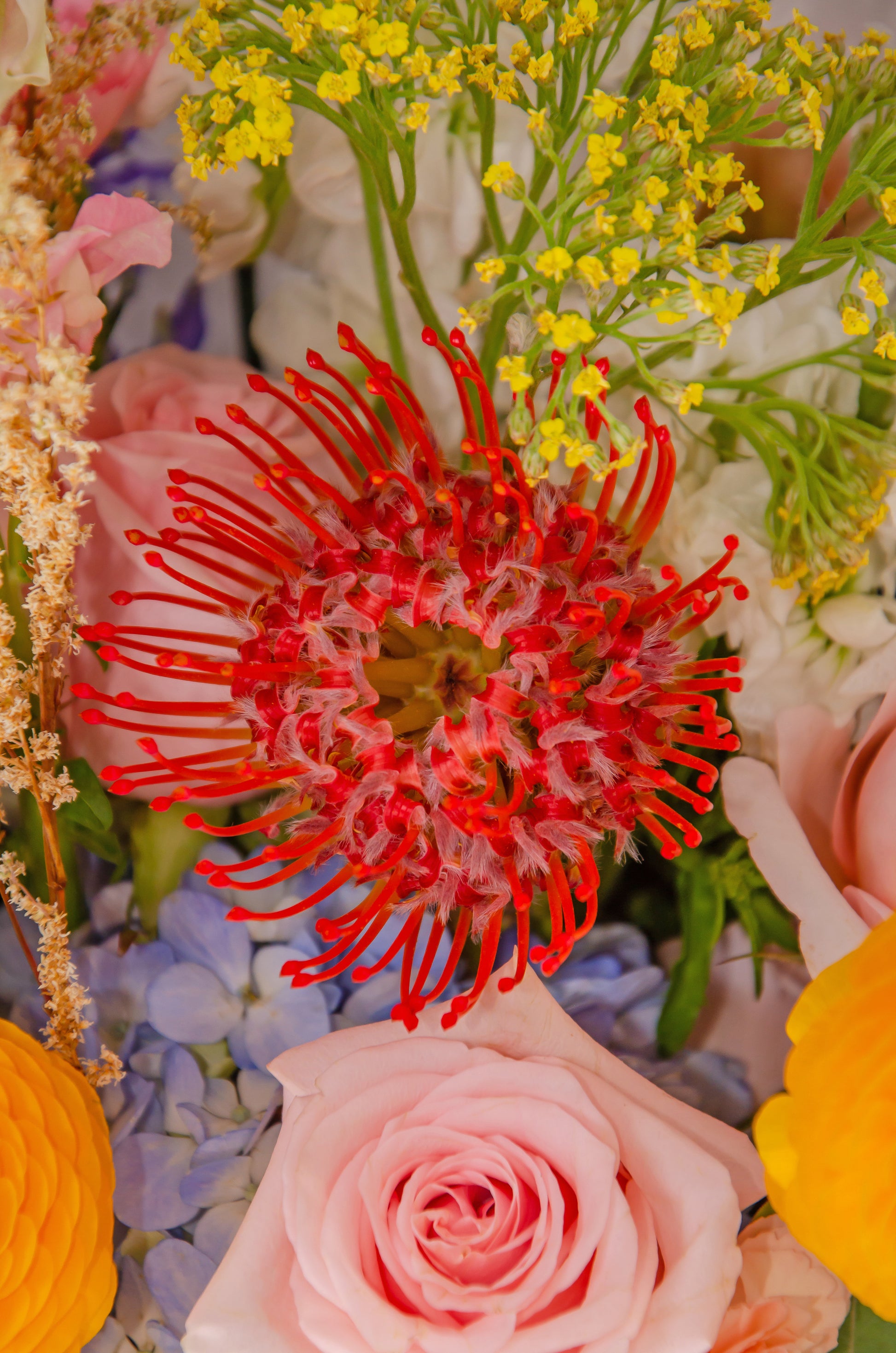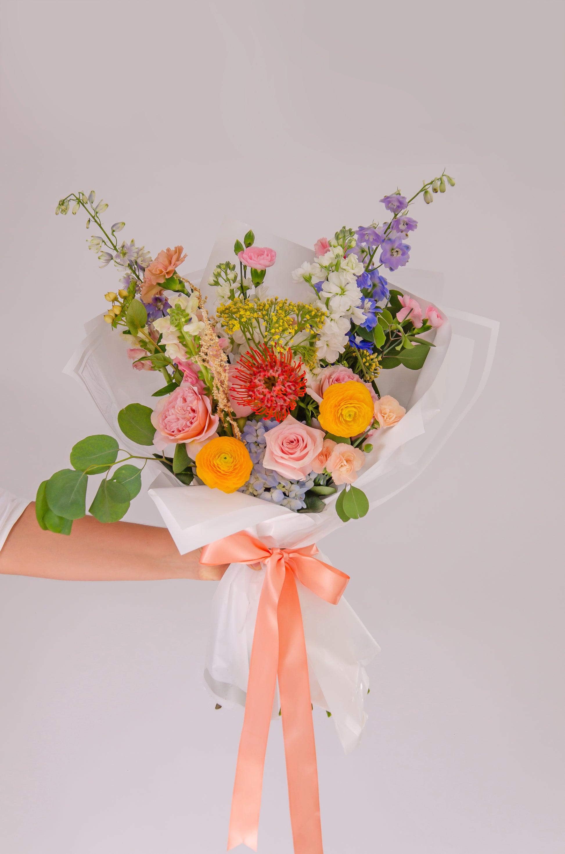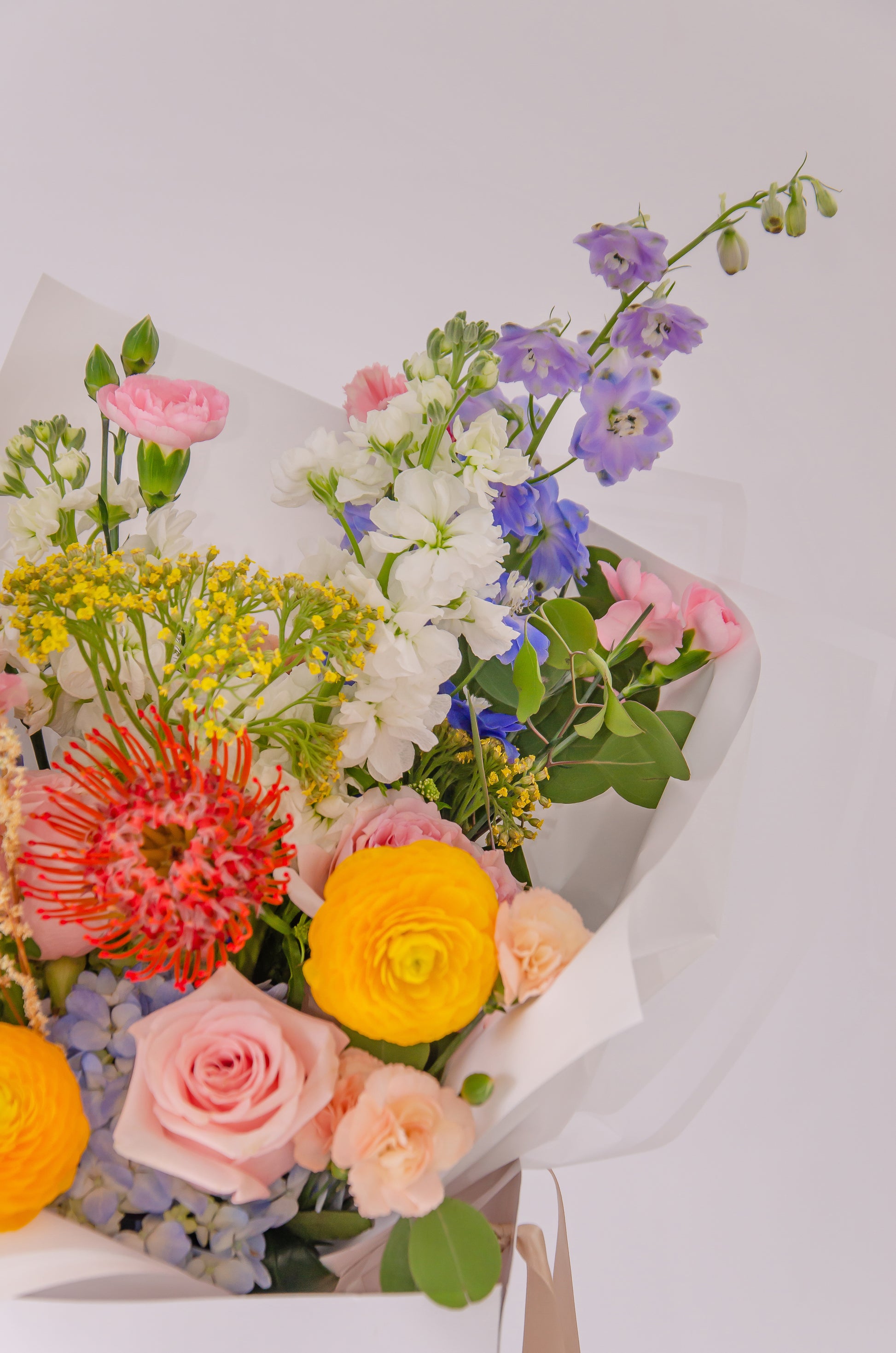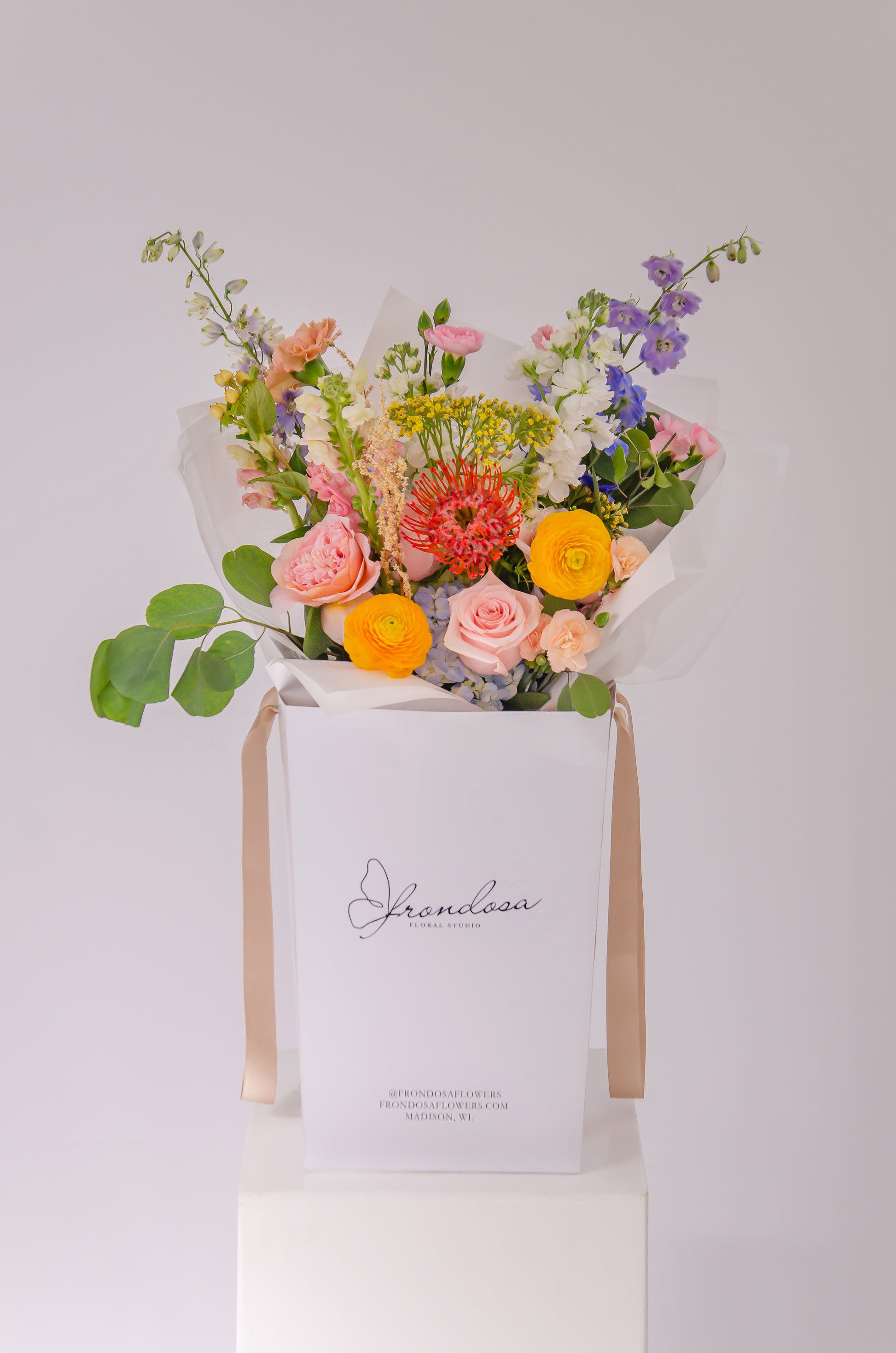 Festejo is a bright, joyful bouquet bursting with Garden Roses, Protea Pincushion, Delphiniums, and lush greenery. Perfect for celebrating birthdays, thank-yous, or any moment that calls for a festive touch. Includes a boutique-style bag and a personalized card upon request.
