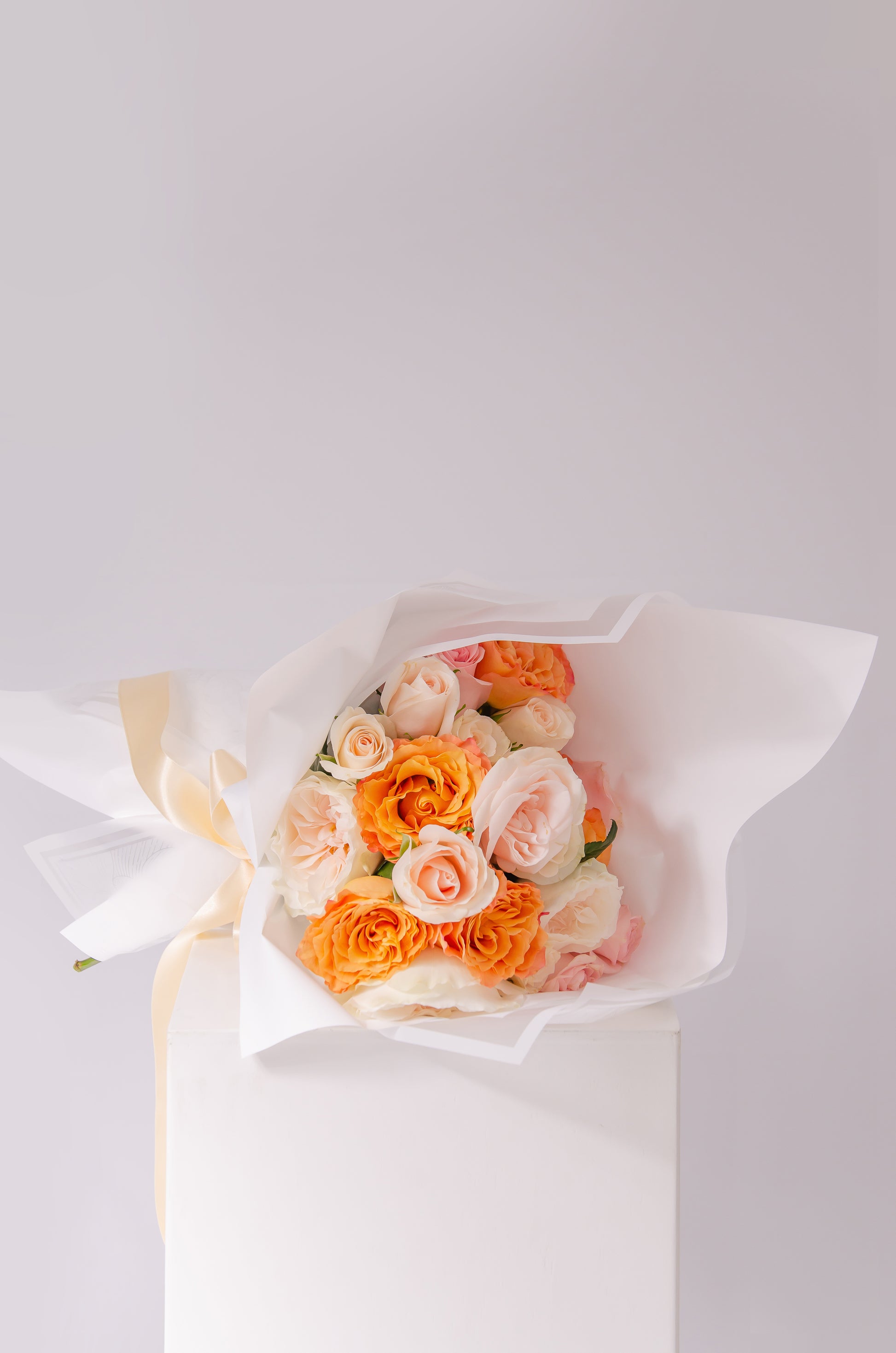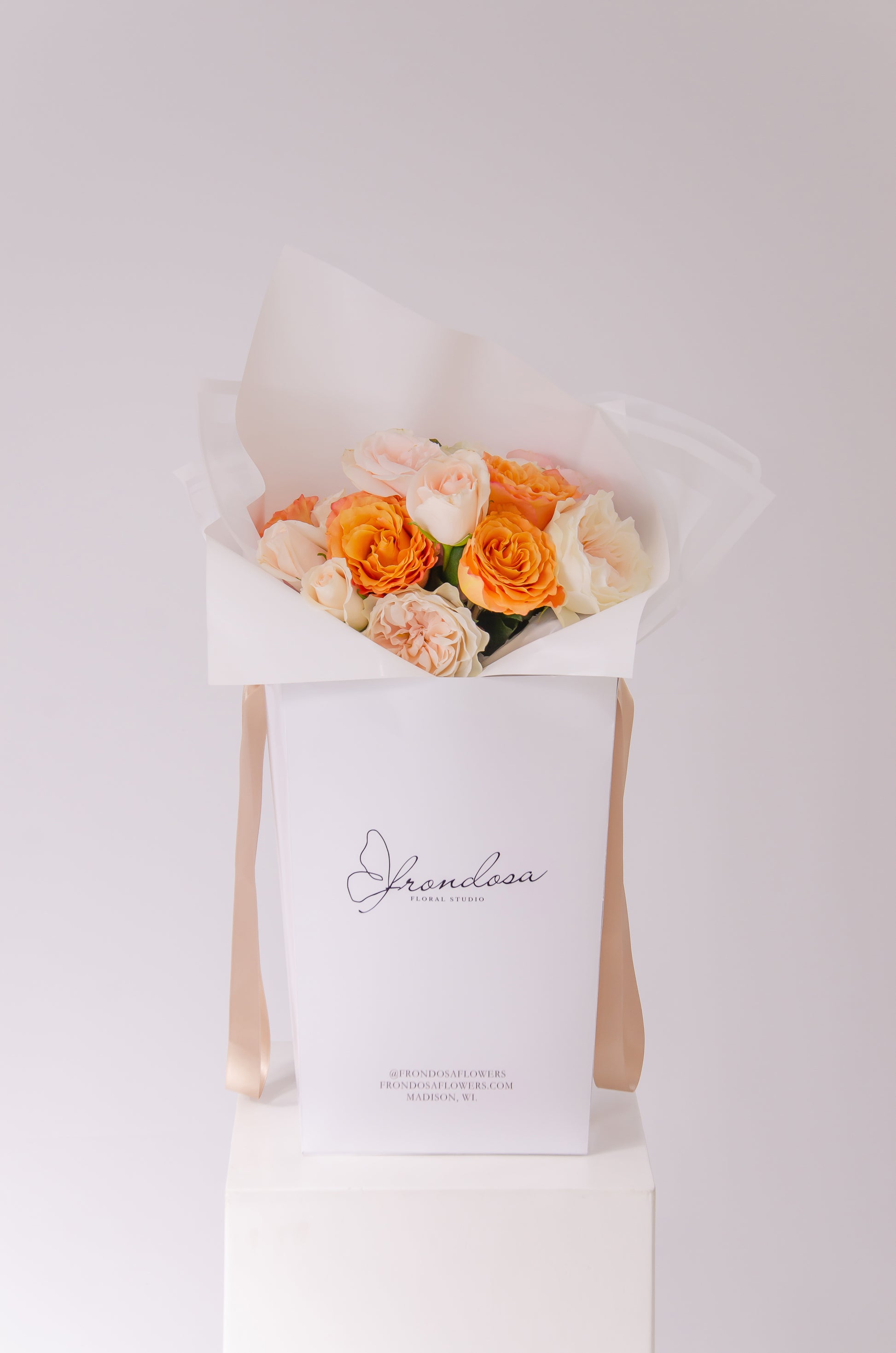 22 stems of garden roses in soft pink and cream. Color can be customized upon request and availability. Includes a bag and personalized card.