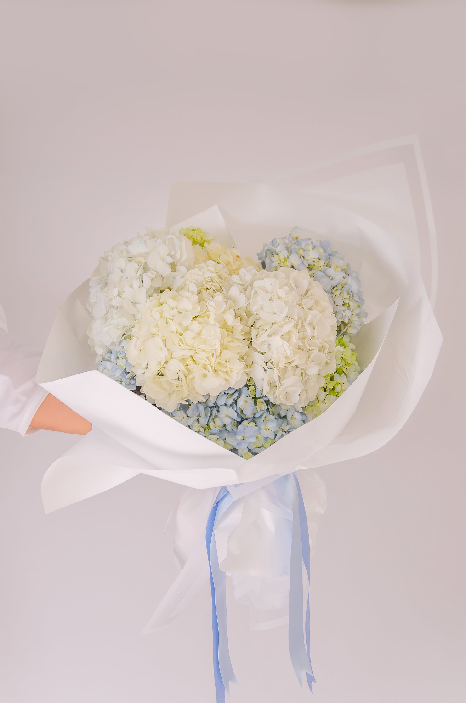 12 stems of hydrangea in soft shades of blue, white, and green. Includes a bag and personalized card.