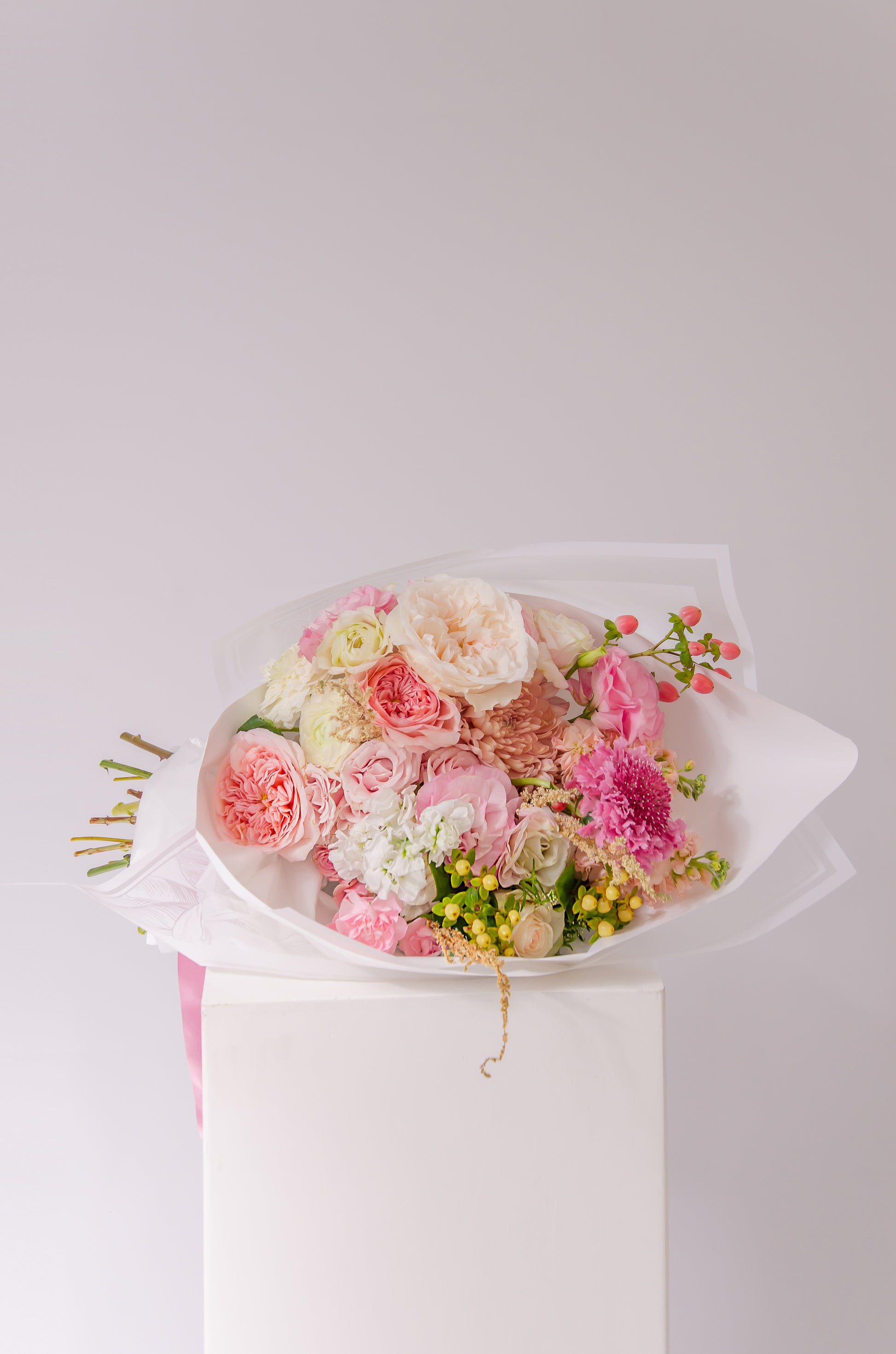 23–25 stems in a romantic, soft, and elegant bouquet that evokes tenderness, tranquility, and classic romance. Includes a bag and personalized card.