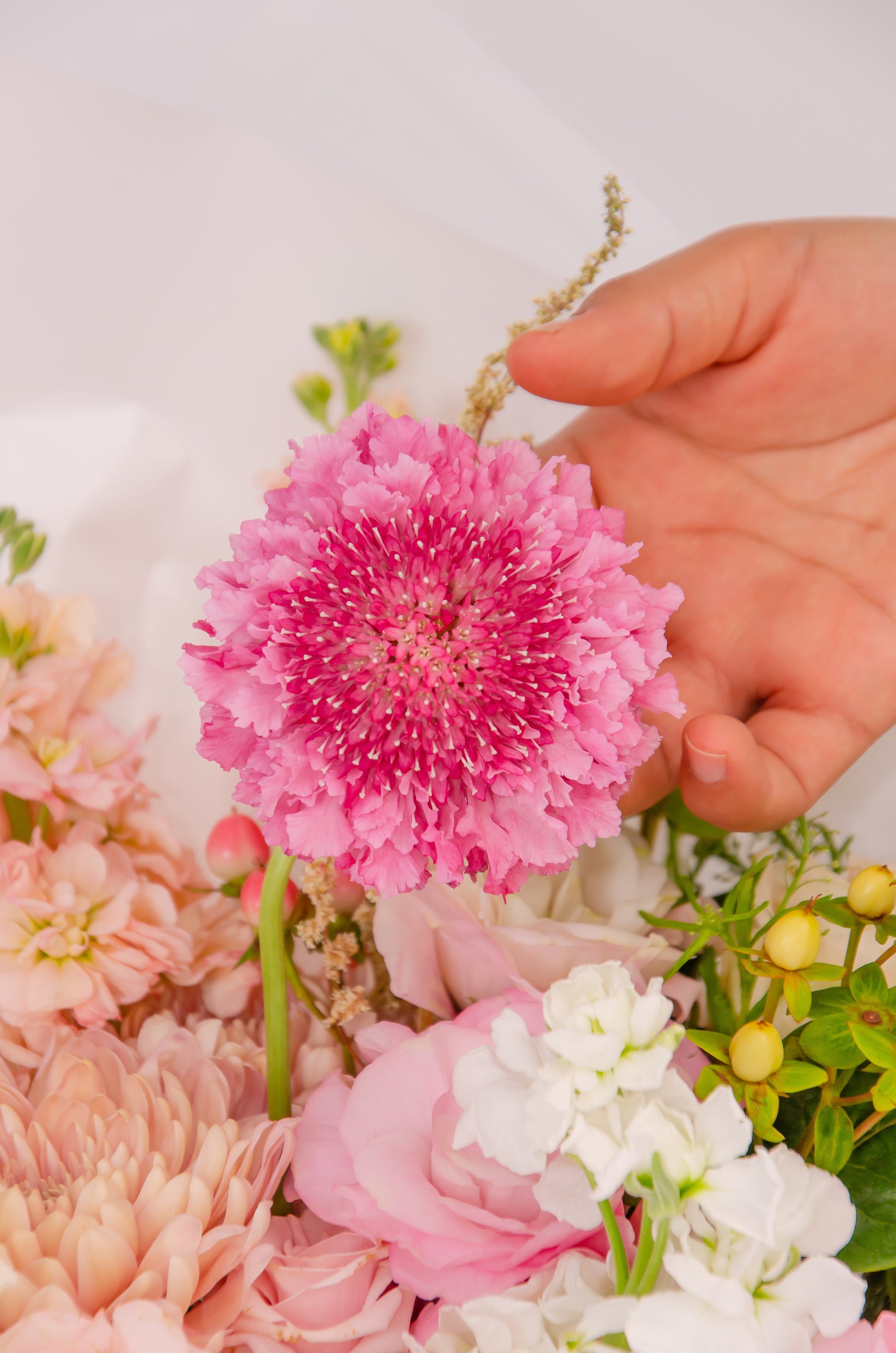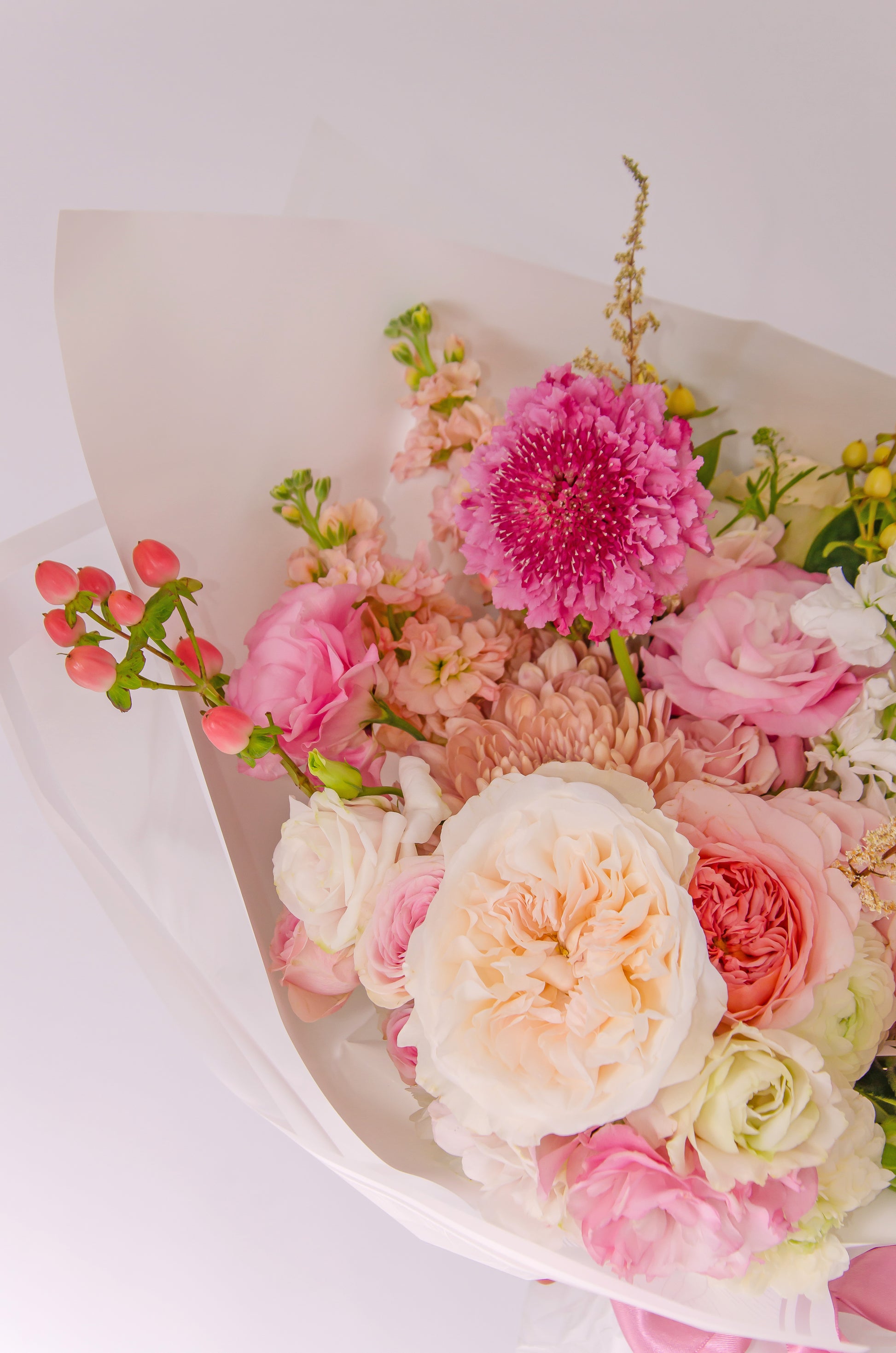 This arrangement features garden roses or peonies, scabiosa, hydrangea, spray roses, sweet pea, gloriosa lily, astilbe, and nerine, in a delicate palette of peach, cream, blush, and dusty rose.